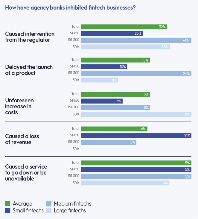 But many fintechs feel they’ve been left in the lurch by their agency bank counterparts. A third of the respondents to the ClearBank survey have dealt with intervention from financial regulators, while 5% have faced a serious outage of services — such as being unable to access payments or retrieve customer funds — due to a fault of their banking partners.