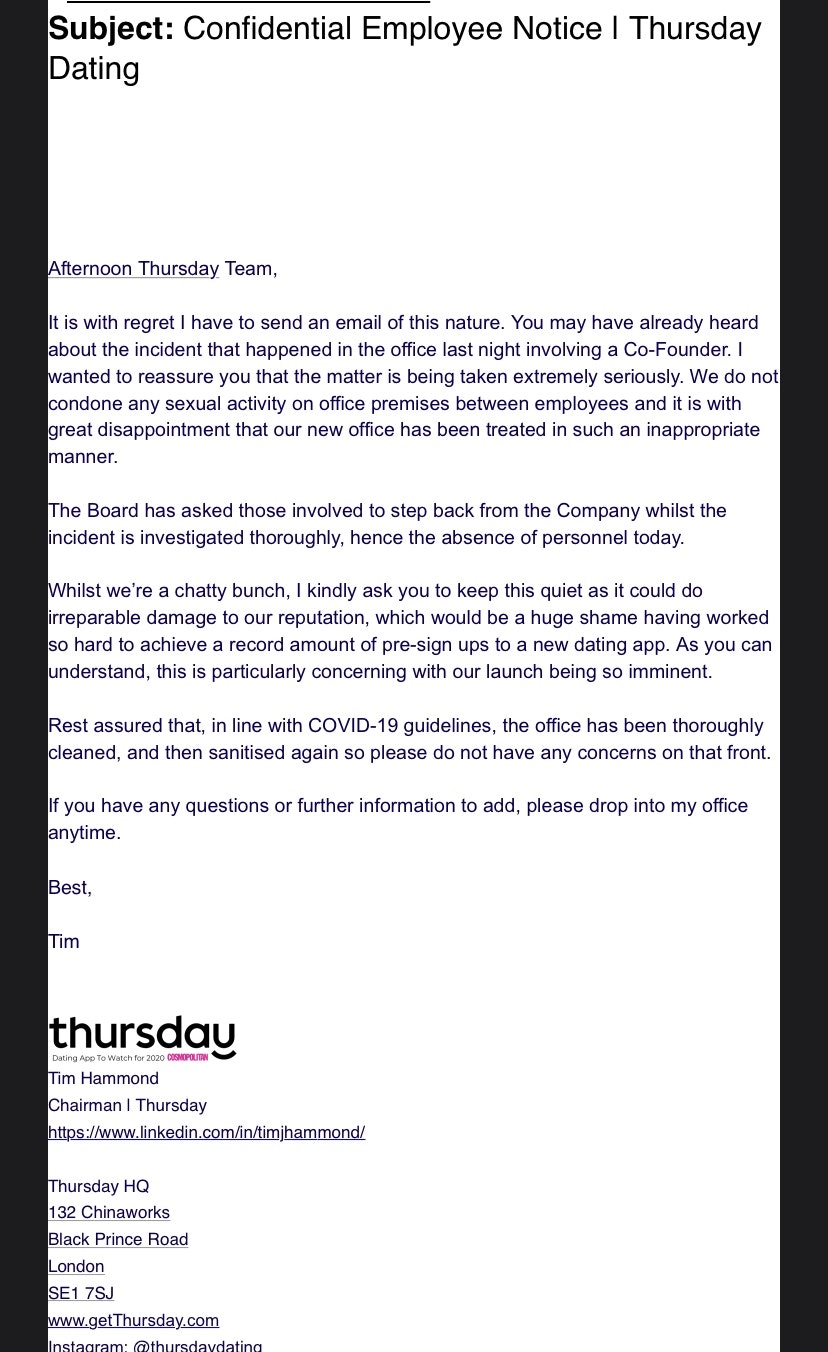 The letter, posted below, expresses “great disappointment” and says that the company's leaders "do not condone any sexual activity on office premises between employees.” Chairman Tim Hammond added that, in line with government guidelines on coronavirus, the office has been “thoroughly cleaned”.