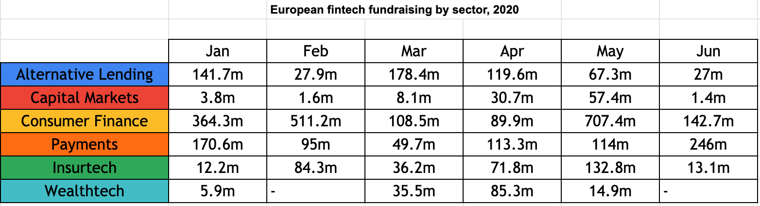Despite a brief funding blip in March, the second quarter of 2020 saw fintechs rake in €1.7bn; only slightly down on the €2bn raised in the first quarter.