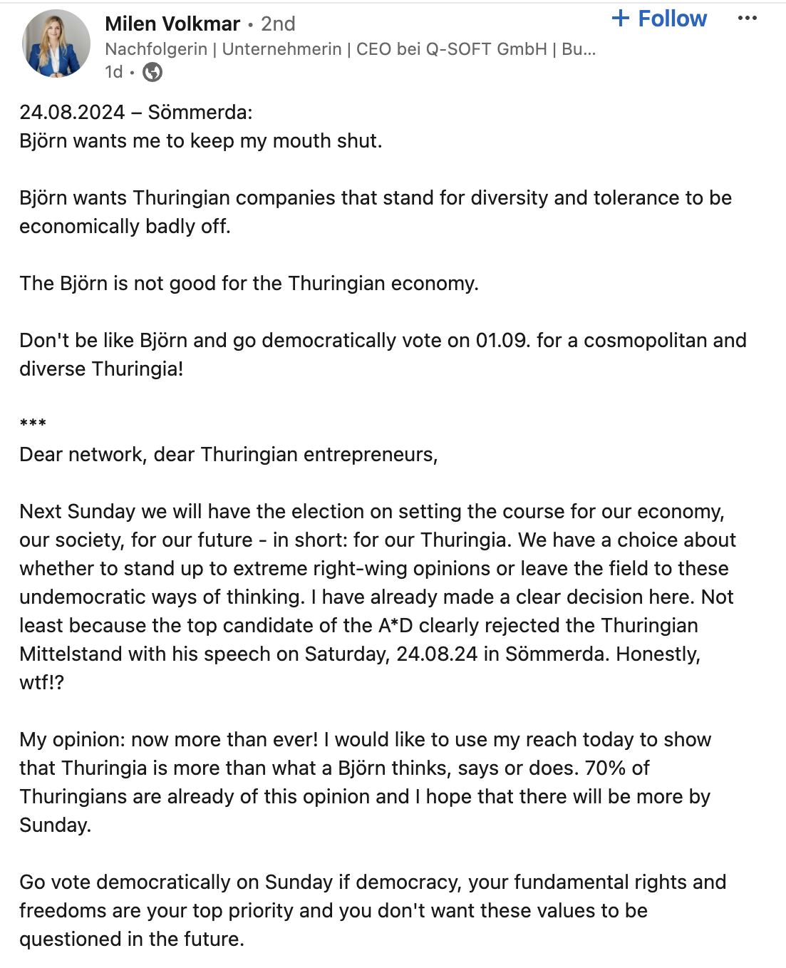 In Thuringia, counter initiatives have been formed to fight for an open and diverse society that celebrates difference: such as “Cosmopolitan Thuringia” — an alliance of over 8k businesses, organisations such as football clubs and research institutions and private individuals. Jenoptik, a large optical tech company in Jena, has its own campaign called “Stay Open”.