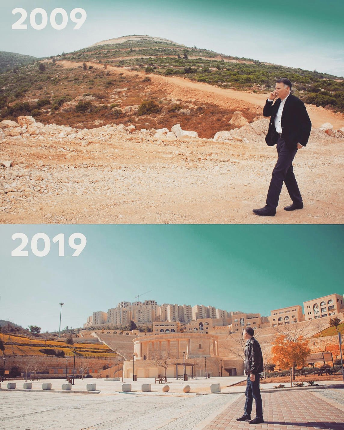 Bashar Masri shared the 10-year “photo challenge” contrasting a photo of him in 2009 and in 2019 in the same place in Rawabi Izk tsvx vm ak jx kxus wrpqsy dp Xswbqeyql?
