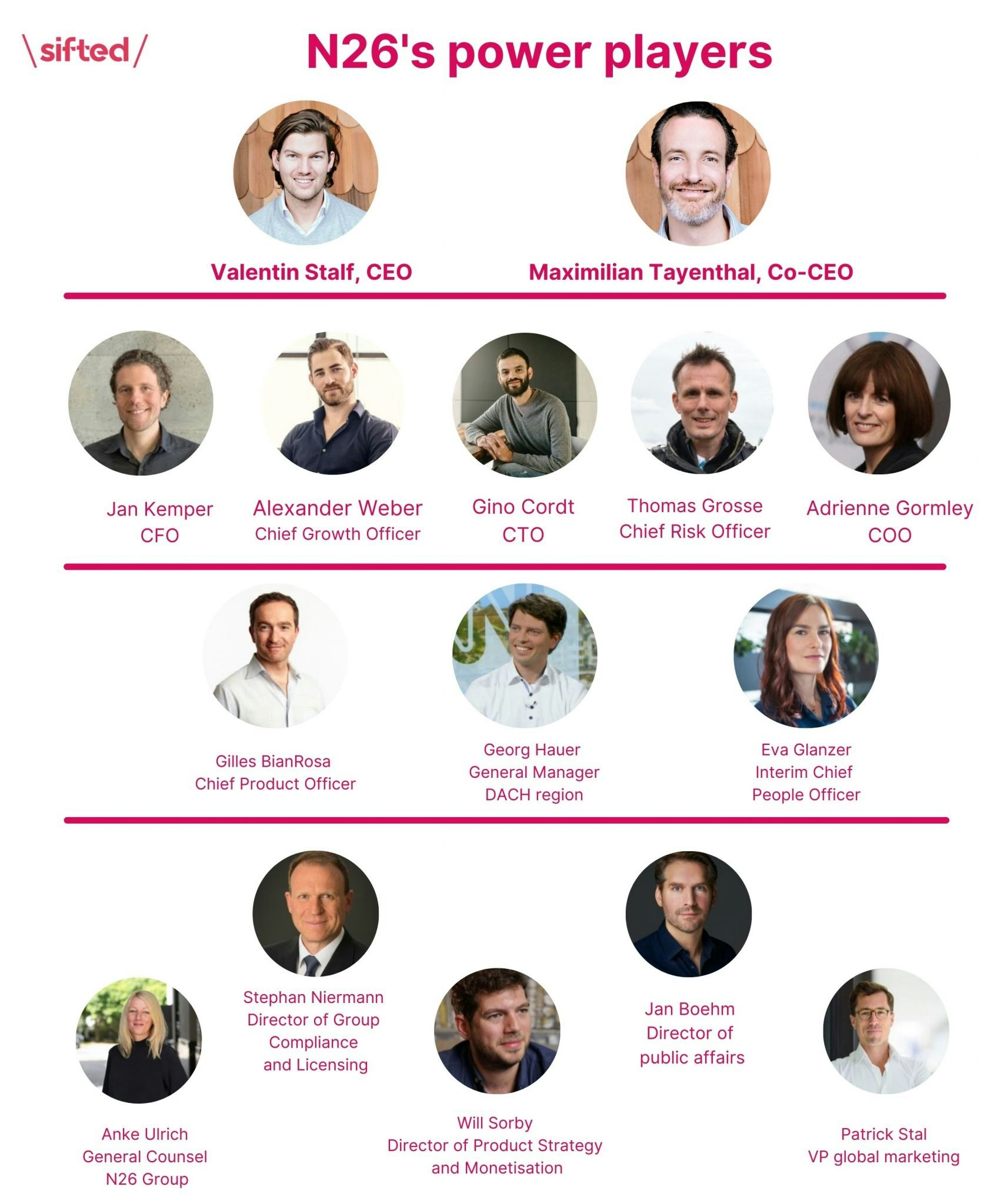 Sifted has identified the 15 most senior people at N26: three of which are women. These are people that — according to multiple sources — have a remarkable level of influence over the business, and who have the ear of the CEOs. The list includes C-suite executives, general managers for key international markets, to those who run key segments like legal, compliance and public affairs.