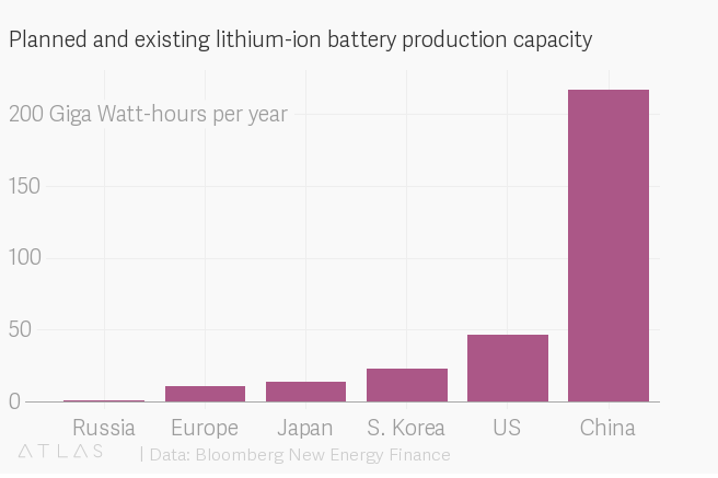 China is ahead when it comes to battery production. According to Bloomberg data, based on planned and existing production plants, 80% of global capacity for lithium-ion batteries is likely to be in Asia, and most of it (69%) in China.