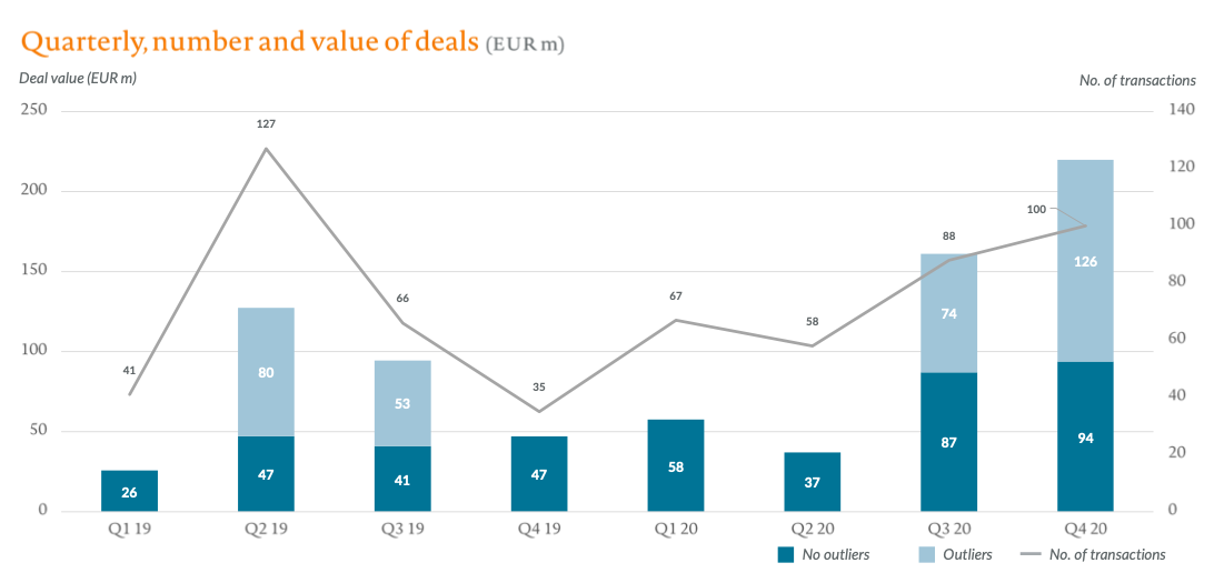 2020 was dominated by large funding rounds for Polish-Finnish space startup Iceye (€74m), online homework help platform Brainly (€67m) and beauty and wellness appointment booking app Booksy (€59m). In fact, the five largest raises accounted for more than half of the total value.