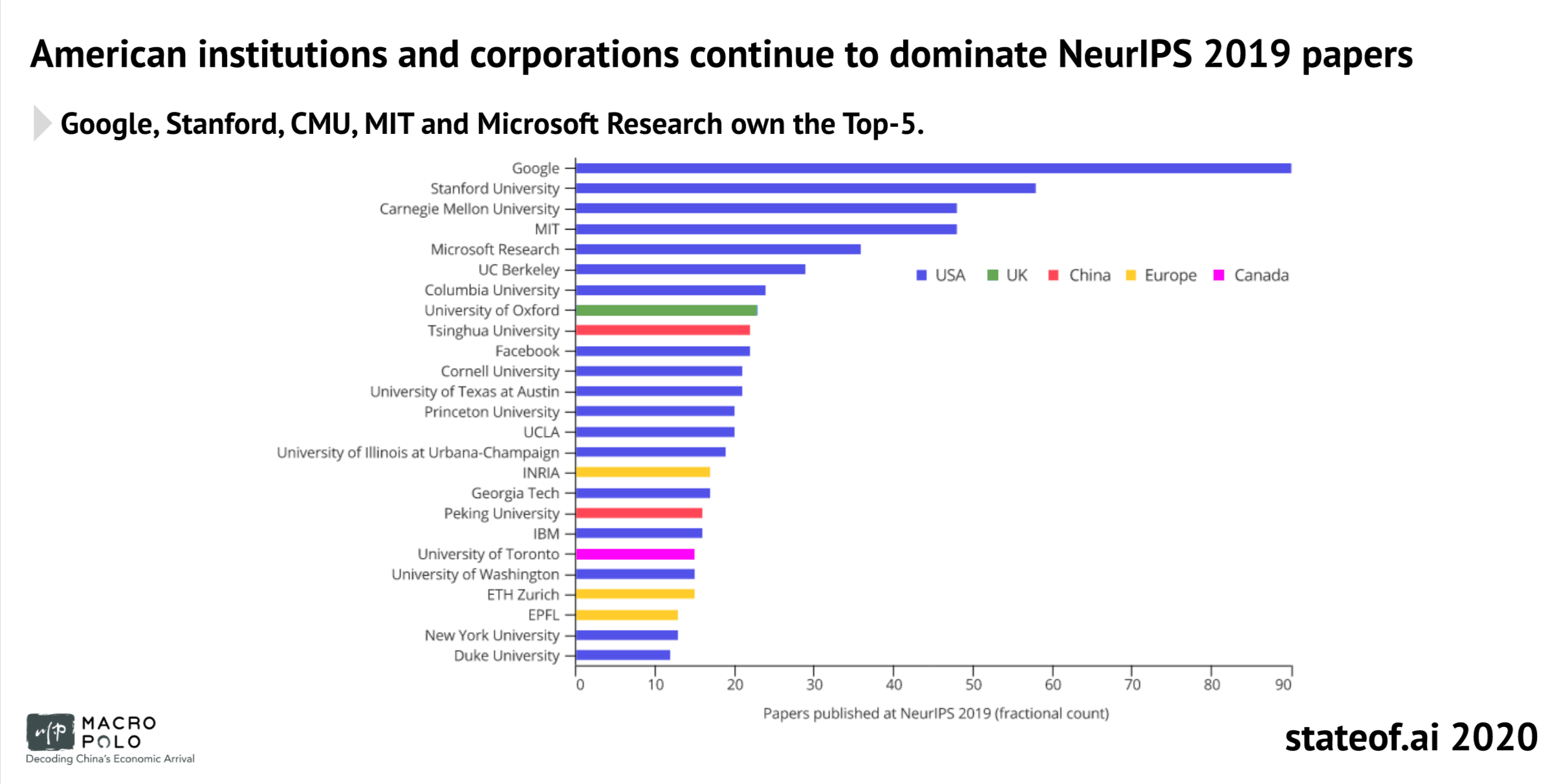 Unsurprisingly, US institutions and corporations present the most papers at the prestigious NeurIPS conference each year. The top five are Google, Stanford, Carnegie Mellon, MIT and Microsoft Research. Only two European institutions (Oxford University and INRIA) make it into the top 20.