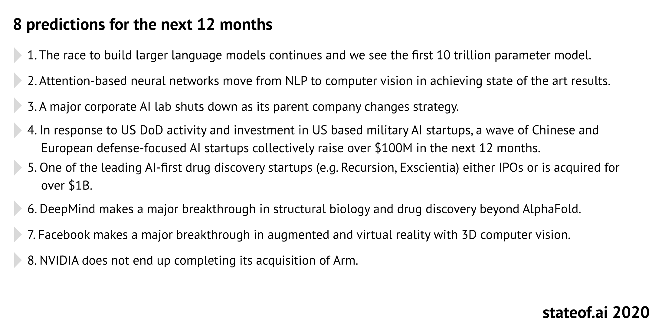 It also predicts that we will see even bigger language models emerging over the coming year (10tn parameters compared with GPT-3’s 175bn) and that there will also be significant improvements in computer vision. Interestingly, the authors suggest that for political reasons Nvidia will not complete its acquisition of Arm, the Cambridge-based chip designer.