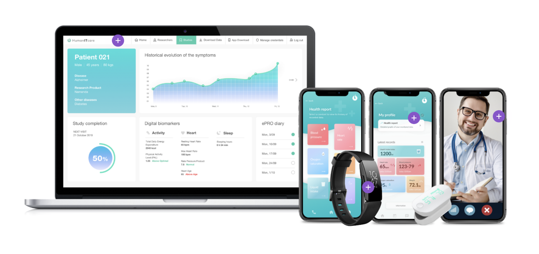 HumanITcare is a remote telemedicine platform that analyses health data from internet of things technologies like smartwatches and smart scales. The artificial intelligence-powered software provides real-time, evidence-based information that can be used for individual health plans, as well as to securely inform clinical research.