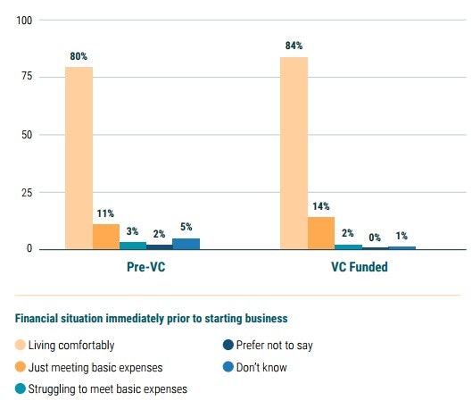 80% of pre-VC founders say they are 'living comfortably', compared to just 3% who say they are 'struggling to meet basic expenses'. This then rises to 84% of VC funded founders who are 'living comfortably'.