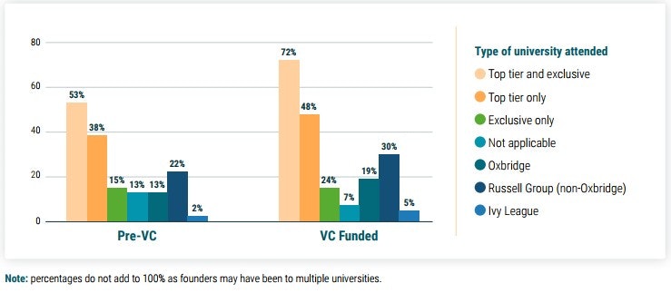 72% of VC funded businesses have founders who went to ‘top tier’ (ie. Russell Group) and ‘exclusive’ (ie. Oxford and Cambridge) universities.